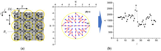 (a) Scheme of filling the image with circular kernels for 2D entropy calculation. (b) Scheme for converting a two-dimensional pixel distribution into a one-dimensional data series zi (R = 4).