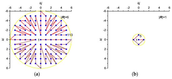 The method of using circular kernels to calculate 2D entropy was developed in []. Its essence lies in the transformation of a 2D image area using circular kernels of a radius R into a one-dimensional series. Figure 4a shows the principle of covering the entire image with circular kernels using a step S and an initial offset DL. Areas that are outside the image boundaries are not defined, so the pixel values in these areas are filled by the symmetrical mirroring of the pixels in the image. To calculate NNetEn2D, the set of pixels inside the local kernel was converted into a one-dimensional data series (Figure 4b), and then, it was calculated in the same way as in the one-dimensional case. In Figure 4b, the sequence of the formation of the elements of the series can be traced along the connecting red line, starting from the center of the kernel n = 1 and ending with element n = 49. The number of pixels N in a circular kernel has a quadratic dependence on the radius, and the evaluation of the sample values is given in Table 1. Example kernels for R = 6 and R = 1 are shown in Figure 5a,b. In this research, we used DL = 0 and step S = 1.