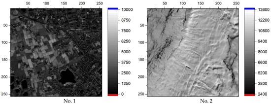 To generate the training set, we used two images numbered No. 1 and No. 2, which are shown in Figure 7 (near-infrared band). One element of the set consisted of a time series of length N and the entropy value. Time series were generated at each pixel using a circular kernel as shown in Section 2.2.5. For two images, the number of pixels 256 × 256 × 2 = 131,072. Before calculating the entropy, each time series was normalized according to the method in Section 2.1. In addition, the entropy was calculated for two normalization options for EN = 0 and EN = 1. As a result, the total number of elements in the training dataset was 131,072 × 2 = 262,144.