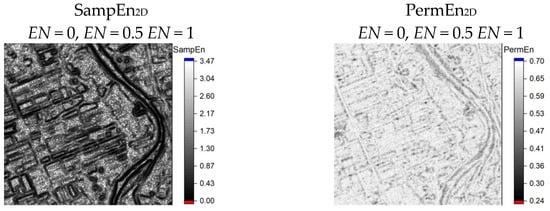 In real-world systems, not only spatial, but also temporal structures are found. Temporal structures are usually studied by analyzing the time series of observational data; spatial structures, as a rule, are usually studied by analyzing two-dimensional images. Along with time series, images are the most important sources of information in remote sensing (RS) imagery [] and geophysical mapping []. Different versions of entropies have been used for remote sensing applications. For example, Shannon’s entropy has been used for measuring urban sprawl [,], and exponential entropy has been used for image segmentation []. The most common entropy way of obtaining entropy, however, is still the use of first- and second-order texture metrics based on quantized Gray-Level Co-occurrence Matrices (GLCM) []. Entropy is also used in image quality assessments [,] and change detection []. Two-dimensional dispersion entropy (DispEn2D) [], sample entropy (SampEn2D) [], permutation entropy (PerEn2D) [], approximate entropy (ApEn2D) [] and Neural Network entropy (NNetEn2D) [] have been proposed for image processing applications, and they can be considered as an irregularity measure for images. To calculate 2D entropy, the approach of transforming a 2D kernel into a 1D time series is often used. For example, a square kernel with alternating row and column readouts could be used []; in addition, the transformation method using the Hilbert–Peano curve is popular due to its low computational cost and its ability to preserve the relevant properties of pixel spatial correlation [,,]. In this work, we applied our own method of transforming a 2D image area into a 1D time series using a circular kernel; the advantage of this is the stability of the result after image rotation [].