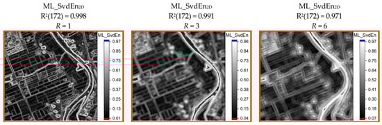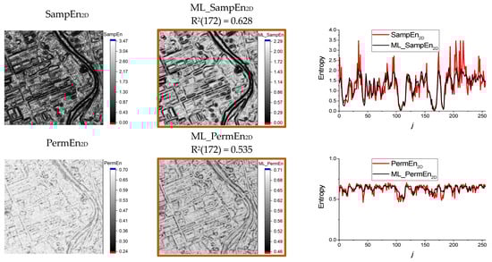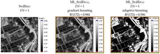 The value of R2mean has a high value close to 1 for ML_SvdEn and ML_NNetEn, which indicates a good approximation of these types of entropies by the ML model. In addition, the standard deviation values for ML_SvdEn2D and ML_NNetEn2D are low, indicating a good approximation of all of the 200 images from the Sentinel-2 database.