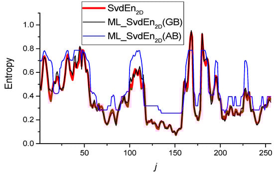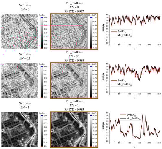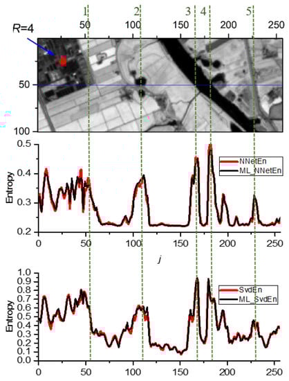 A comparison of the distribution of SvdEn2D and ML_SvdEn2D entropies for image No. 172 is shown in Figure 17, which also shows a comparison of the horizontal profiles of SvdEn2D and ML_SvdEn2D for i = 50.