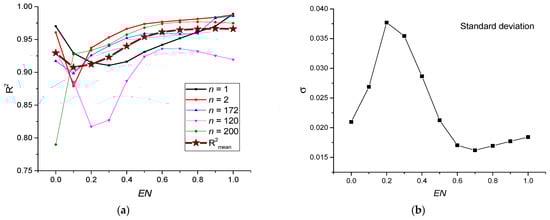 The R2 values of ML_SvdEn2D, ML_SampEn2D, ML_PermEn2D and ML_NNetEn2D for the normalization parameter EN = 1 are shown in Figure 18. The figure also shows the average levels of R2mean. R2mean have high values of R2mean > 0.9 for ML_SvdEn2D and ML_NNetEn2D, and low values for ML_SampEn2D and ML_PermEn2D.