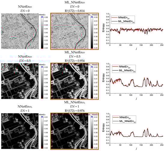 It can be seen that the approximation of SampEn2D and PermEn2D is significantly inferior to the approximation of SvdEn2D and NNetEn2D. The distributions and profiles for NNetEn2D practically coincide, which indicates the applicability of the ML regression entropy approximation model. The best distribution contrast of NNetEn2D and ML_NNetEn2D is observed for EN ≥ 0.5.