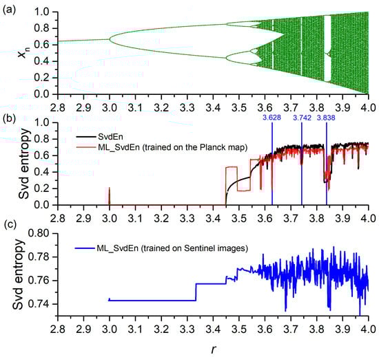 Bifurcation diagrams for logistic map (Equation (21)) (a); the dependence of SvdEn and ML_SvdEn on the parameter r (N = 29, EN = 0, d = 20 and delay = 1) (b) the dependence of ML_SvdEn trained on Sentinel images (c).