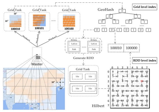 According to the external grid index, we can quickly locate the remote sensing images contained in the grid by latitude and longitude through the modified GeoHash code. For the internal index, the Tile RDD obtained after partitioning the remote sensing image RDD is encoded by the Hilbert curve so that the index construction of the RDD is realized. Using two-layer RDD RS data indexing, we improve the sorting and query efficiency of RS data.