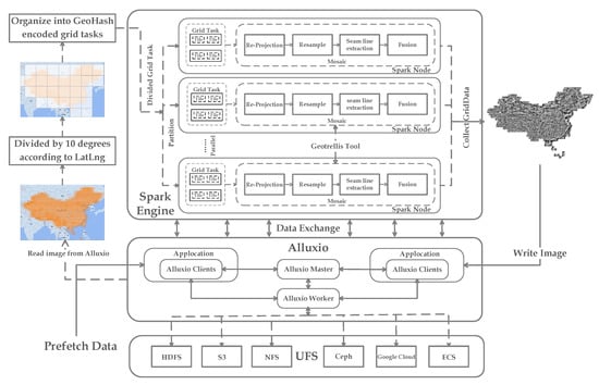 To tackle the above challenging issues and achieve satisfying performance enhancement, we demonstrated an in-memory distributed large-scale mosaicking with geo-gridded data staging accelerated by Alluxio. The main idea is that it adopts Spark as the basic distributed stream computing framework to implement large-scale mosaicking as geogrided tasks and employs Alluxio to facilitate in-memory big remote sensing data orchestration and staging throughout the entire processing chain. Practically, the RS images are too numerous to directly flood into the Spark engine, since the whole processing could be stuck and lead to discouraging performance or even make it unfeasible. Assisted by GeoTrellis, this approach organizes the enormous number of “messy” RS images into GeoHash-encoded grid tasks through discrete global grid (DGG) division and orders them with multi-dimensional space-filling curves and geo-encoded indexing. Powered by Spark, it breaks down the entire large-scale mosaicking into groups of grid tasks and simultaneously implements them as buckets of spark jobs in parallel through the divide-and-conquer method. Following this way, a two-level parallelism could be exploited, since each divide grid task with geo-eocoding could be further fit into Spark as fine-grained jobs. The main contribution is that this paper finds a new way out to break through the I/O bottleneck by employing Alluxio, a virtual distributed file system, to enable in-memory data staging throughout the whole processing phases of the entire mosaicking procedure by adaptive data prefetching. Thus, it not only prefetches the data required for processing but also elaborately orchestrates the intermediate data result for the next processing step through data staging and transparent data prefetching. Consequently, the data transmission among processing chains could be eliminated to a great extent to maintain a better data locality.