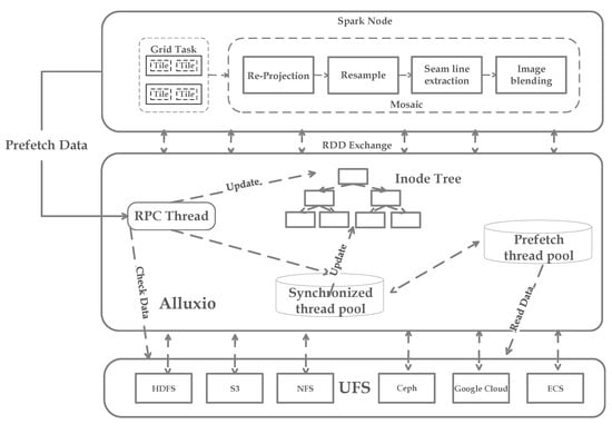 The distributed file storage system can alleviate the I/O bottleneck while meeting the needs of distributed computing and storage [,] such as Google File System (GFS) [], Hadoop Distributed File System (HDFS) [], Lustre [], Ceph [], GridFS [], FastDFS [], etc. With the increasing demand for large-scale mosaicing, frequent and inefficient I/O operations lead to overall performance degradation, while traditional distributed file storage systems are expensive, have poor scalability and fault tolerance [], and cannot meet performance requirements. The process of caching fast access does not need to access the actual information source, which can improve the I/O performance []. Alluxio is a memory-based file management system which caches data into memory [] to obtain a high-speed accessible data layer and improves I/O speeds by making the best of cluster memory. In addition, Alluxio enables computing programs to achieve memory-level I/O throughput by moving computation closer to the stored data. Combining it with computationally intensive remote sensing image mosaicking can alleviate I/O bottlenecks in the mosaicking process.