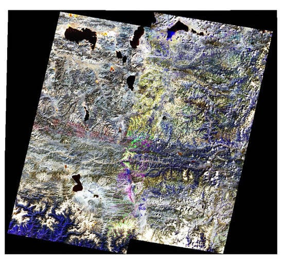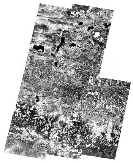 During the experiment, this paper selects optical images (Landsat-5, 7, 8) for single-band mosaic experiments and SAR images (Sentinel-1) for mosaicking. The Sentinal-1 satellite image used in the experiment is the Ground Range Detected (GRD) product, the polarization mode is VV + VH, and the scanning mode is Interferometric Wide swath (IW) mode. As shown in Figure 4, we use three SAR images of the Sentinel-1 satellite with a size of 850 MB for the mosaic experiment. As shown in Figure 5, in order to show the mosaic effect more clearly, we used four Landsat-7 images for mosaic and selected 2, 3, and 4 bands for RGB synthesis. It can be seen from the experimental results that for the image processing of the same type of sensor, the algorithm proposed in this paper can better handle the problem of seam line extraction. In the mosaic results of SAR images and Landsat-7 images, no obvious seam lines are seen in the overlapping area. The RBG composite image also shows that there is no obvious color distortion, and the image mixing effect is also good.