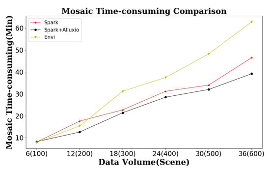 To compare the time consumption, we select 100 to 600 data volumes for remote sensing image mosaic testing and compare the total time to verify the effectiveness of using Spark with Alluxio as the file system and only using Spark for mosaicking. Since the geographic reference coordinate systems of the input data are not necessarily the same, a unified coordinate system conversion is required first. This step is also included in the total time.