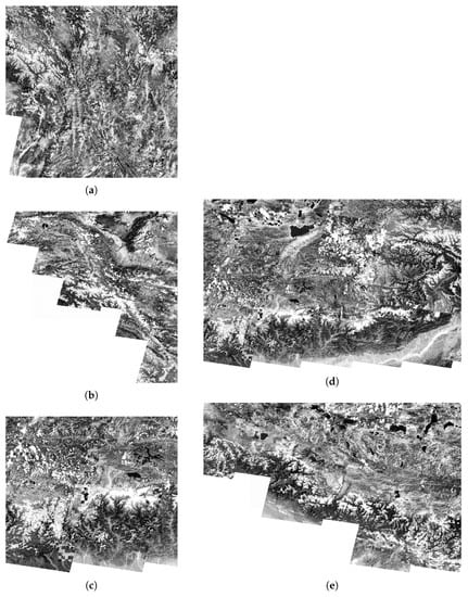 It is noteworthy that the unprecedented availability of enormous earth observation Analysis-Ready Data (ARD) [] has further stimulated increasing interest in global resource and environmental monitoring [,,], such as the Global Rain Forest Mapping (GRFM) project [] of Japan, and the global crop production forecasting system of Global Agriculture Monitoring (GLAM) project [] using MODIS near real-time data. In a nutshell, great efforts have been invested in exploiting an extremely large amount of multi-sensor and multi-temporal satellite data for analysis at a much larger scale than ever. Under this circumstance, capturing a wide field-of-view (FOV) [] scene covering a full region of interest (ROI) [] has become quite common and also critical, especially concerning the imaging width limitation of a single sensor with higher resolution. In recent years, large-scale imagery mosaicking [] has drawn particular attention and become an indispensable task not only for illustrative use but mapping [] and analysis []. The GRFM project [] stitched 13000 JERS-1 SAR scenes to build rainforest mapping for tropical Africa, while the United States Geological Survey (USGS) mosaicked Antarctica mapping [] out of over 1000 images. Moreover, some large-scale crop mapping [,,] and vegetation clearing mapping [] even employ enormous EO data for on-line processing on Google Earth Engine (GEE).