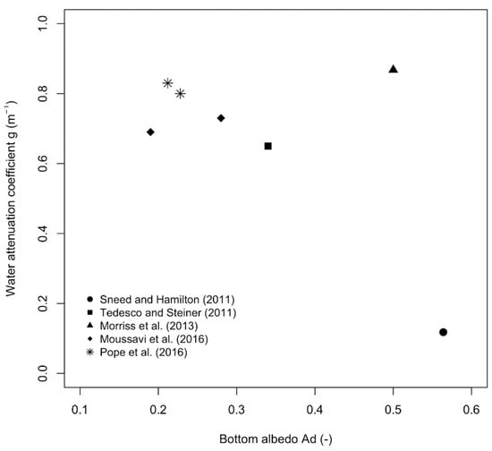 Comparison of the water attenuation coefficients with the lake albedo values from various published studies. Symbols represent different publications [14,24,26,42,47].