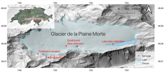 For our field experiment, we chose a lake on the Glacier de la Plaine Morte in the Bernese Alps in Switzerland (Figure 2). This lake (Lac des Faverges) is an ice-marginal lake; nevertheless, the bottom of the northern part of the lake is created by a glacier, making it suitable for our experiment as an SGL. A considerable part of the Glacier de la Morte is impermeable to water flow. Therefore, meltwater accumulates in surface streams [51]. According to Hählen [52], the lake has a considerable water volume of about 1.5 Mm3, and growth is expected. Lac des Faverges, as well as another two smaller lakes on the margin of the Glacier de la Morte, is formed at the border of a glacier and impermeable sediments, making it potentially unstable. Between 2011 and 2013, some of the lakes were subject to subglacial drainage [52]. Lac de Faverges is refilled annually, and meltwater accumulates in the lake basin. After reaching the maximum level of 2752 m above sea level, the lake water is drained through a superficial channel in the moraine deposit towards the Tièche basin [51]. Lindner et al. [53] described the typical fractures on the Glacier Plaine de la Morte on a centimeter or decimeter scale.