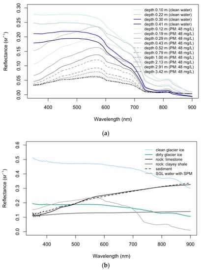 Furthermore, we present the spectral curves of the clean glacier and glacier ice affected by the deposit particles, the spectral curves of the rock near the glacier (limestone and clayey shale), and its sediment collected at the edge of the Glacier de la Plaine Morte (Figure 4b). Both glacier spectra are monotonously decreasing with an increasing wavelength up to 900 nm. The difference is in the absolute values of the reflectance modified by the presence of impurities on the glacier surface. Pure ice is very weakly absorptive in the VIS spectral region. The observed absorption in the VIS is the tail of NIR vibrational absorptions [58]. Therefore, the absorption increases with increasing wavelength from blue to red. The rock and sediment spectra exhibit an increase, on the other hand, with the wavelength. The spectral effect of the SPM in the lake water corresponds to the sediment spectra up to 700 nm.