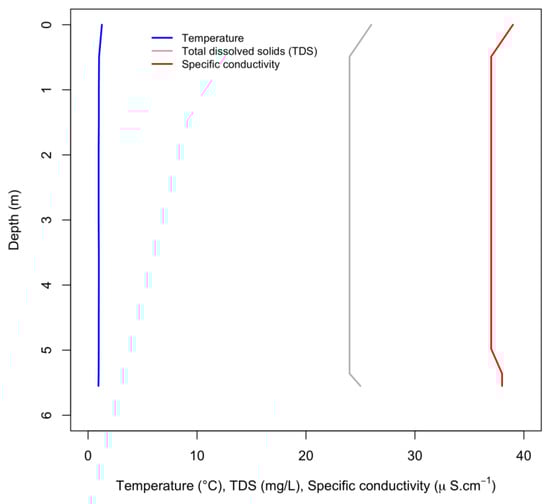 Water temperature, dissolved solids and specific conductivity of total dissolved solids (TDS) in Lac des Faverges at the time of SGL measurements.