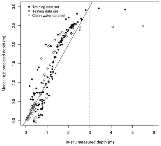 We constructed the first empirical PLSR model (abbreviated as 1) from all the collected data from Lac des Faverges (water with SPM) up to 8.62 m, even though the saturation effect is well visible from the plotted spectra (Figure 4a). Additionally, we constructed a model (abbreviated as 1b) from the spectra collected from the small pond (clean water), limited to the depth of about 50 cm. The models were cross-validated using the “leave-one-out” method. The RMSEP indicator proved that the PLSR model 1a with the first five components provides the best option. The lake depth values predicted against the in-situ measured data revealed that the model does not explain the variation for depths higher than approximately 3.0 m (Figure 6), which confirms the saturation effect visible in the plotted spectra (Figure 4a). Additionally, it documents the effect of the SPM in the water on empirical modelling of the SGL depth, albeit to the limited depth of the clean water. The model 1a shows not only the saturation effect but also the much higher dispersion of the points from the 1:1 line (Figure 6). Performance of the models is summarized in Table 2. The model 1b was only cross validated; a testing subset was not created due to the limited number of records.