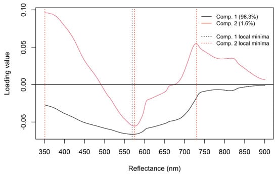 The two PLSR model 2 factor loading weight vectors with local maxima (vertical lines).