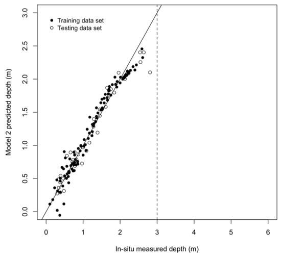 In the subsequent analysis, we constructed a second PLSR model (abbreviated as model 2) limiting the lake depth readings to 3.0 m only, to evaluate the model performance in this range and to avoid the effect of the saturation caused by SPM. The range of the depth in the training (calibration) data set is 0.1 to 2.91 m and the range in the testing (validation) data set is 0.34 to 2.55 m.
