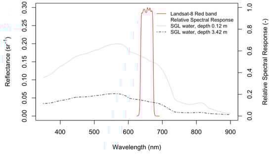 In the analysis with the physically based model, we initially ran the model (1) with parameterization as estimated by Pope et al. [14] for the Landsat-8 sensor, red band. To apply the single-band model, we convolved the continuous FieldSpec® 4 (ASD Inc., Boulder, USA) records based on the relative spectral response curve for Landsat-8 [55] (Figure 10). Although the SGL water spectral values in the range of the broad Landsat-8 red band are monotonous and the effect of convolution is minimal, we applied this step for full consistency, while using the parameterization of the model for the Landsat-8 band.