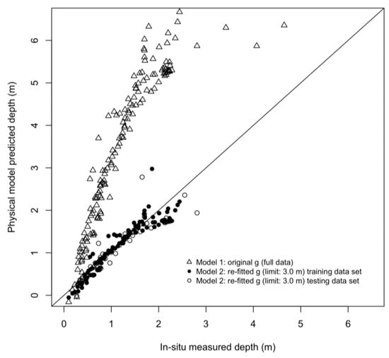 The physical model 1 predictions against our in-situ measured water lake depths at Lac des Faverges (SPM = 48 mg/L) are presented in Figure 11 (open triangles).The predicted lake depth values are highly overestimated given the fact that we used the g parameter (attenuation coefficient), which was regressed for water without the presence of SPM. The model 1 quality metrics (RMSE and R2) are presented in Table 3. In order to quantify the effect of SPM (48 mg/L) in the lake water on the change of the water attenuation, we re-fitted the physical model with g as a free parameter. The original attenuation coefficient g was 0.8 m−1, while the newly fitted g equals 2.42 m−1. We fitted physical model 2 to the training data set (Figure 11, full dot) limited to a plausible depth of 3.0 m as determined in the previous analysis, since the water spectra became saturated at greater depths given the presence of SPM. The model 2 quality metrics are presented in Table 3.