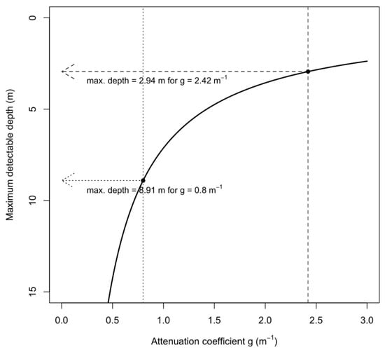 Philpot [41] describes the maximum detectable depth using several LDN/Lb ratios. Selecting the ratio value of 0.001 from the Philpot [41] publication, Figure 12 shows the change in the maximum detectable depth for various water attenuation coefficients. The detectable maximal depth increases with a decrease in the effective attenuation coefficient g. In a case where the water attenuation coefficient g = 2.42 m−1 (re-fitted value for lake water with SPM concentration of 48 mg/L at Lac des Faverges), the maximum detectable depth is 2.9 m. This corresponds to our previous findings described in Section 3.1, Section 3.2 and Section 3.3. The maximum detectable depth would increase up to 8.91 m in the case of an attenuation coefficient g = 0.8 m−1, using the value of g estimated by Pope et al. [14] from in-situ data collected from Greenland, assuming there was no dissolved or suspended SPM in the lake water. This illustrates the importance of the attenuation coefficient parameter in the model.