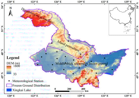 Location of Heilongjiang province with the spatial distributions of frozen ground type and 26 meteorological stations. The distribution map of frozen ground was provided by the National Cryosphere Desert Data Center (http://www.ncdc.ac.cn (accessed on 15 May 2022)). The background reflects the altitude. DEM: digital elevation model.