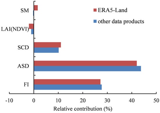 Relative contributions of five variables to MSFD variation for the entire region based on data from 26 stations during the 30-year baseline period (1981–2010). The red bars represent the data of SM and LAI were obtained from ERA5-Land reanalysis dataset. The blue bars represent the data of SM and NDVI were obtained from other data products (see Section 2.2). The negative contribution may suggest that the effect of this variable on MSFD variations can be considered truly unimportant [64].