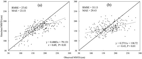 Comparison of the observed and simulated MSFD values using the (a) multiple linear regression equation (see Equation (S1)) and (b) simplified Stefan solution (see Equation (S2) in Supporting Materials) for all 26 stations during the 10-year validation period (i.e., 1975–1980 and 2011–2014). The black solid line is the 1:1 line.