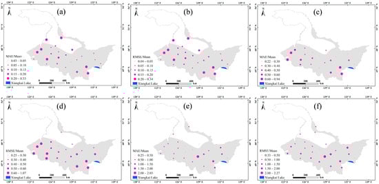 Statistical criteria of the calculated FI (a,b), SCD (c,d), and ASD (e,f) using the ERA5-Land reanalysis dataset against observed data from 26 meteorological stations in Heilongjiang province. RMSE/Mean and MAE/Mean refer to the ratios of MAE and RMSE to annual mean FI, ASD, and SCD, respectively.