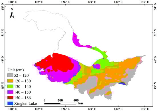 Based on the 30-year baseline period (1981−2010), the spatial distributions of the MSFD of SFG varied greatly (Figure 5). The average MSFD for the entire region was 132 cm, ranging from 52 to 186 cm. The areas at depths of 52–120 cm, 120–130 cm, 130–140 cm, 140–150 cm, and 150–186 cm accounted for approximately 20.66%, 28.68%, 14.19%, 19.86%, and 16.62% of the total area of SFG, respectively. As shown in Figure 5, the higher MSFD was mainly concentrated in the north (e.g., > 140 cm), whereas the lower MSFD was mainly concentrated in the south (e.g., < 120 cm). Overall, the MSFD displayed an increasing trend from southeast to northwest.