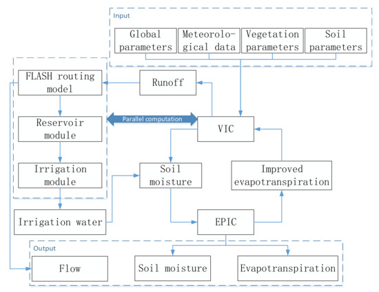 Because crops require irrigation during the growth process, irrigation water from groundwater, rivers, and reservoirs is required. The calculation of water volume originating from rivers and reservoirs is inseparable from river routing; consequently, it was necessary to couple the routing module, reservoir module, and irrigation module with the VIC model. The routing model was the flexible large-scale hydrological routing model (FLASH) based on the merged grid [30], and sequential coupling was adopted between the VIC and the routing models. The VIC model passed the surface runoff and underground baseflow of each merged grid to the routing model, and the routing model was subsequently executed. Based on the runoff and routing models, an integrated coupling was used between the reservoir module and the routing model. The routing model transmitted the river flow data to the reservoir module, and the reservoir module performed the water balance calculation of the aggregated reservoir and simulated the water storage of the aggregated reservoir moment-by-moment [31]. The reservoir module returned the calculated discharge to the routing model. The irrigation module was coupled with a reservoir module. The irrigation module calculates the actual irrigation water based on the water storage value of the reservoir module, which supplements the actual irrigation water to the soil water content and passes the updated soil water content to the EPIC model. The construction principle of the VIC-EPIC model [32,33] is shown in Figure 1.
