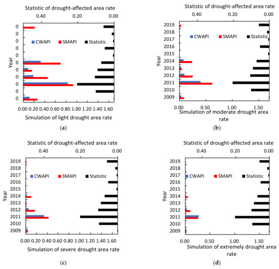 Bar diagrams of the statistical values of drought-affected area rates and the area rates of different drought grades in Jiangsu Province from 2009 to 2019 (a–d correspond to light, moderate, severe, and extremely drought area rates, respectively).