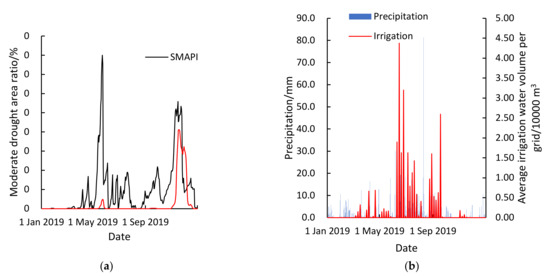 (a) Time courses of the area ratio of the moderate drought grade calculated by SMAPI and CWAPI; (b) Time courses of precipitation and irrigation of Jiangsu Province in 2019.