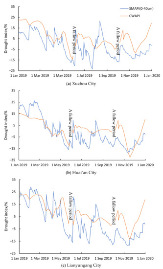 The process of change of the drought index in Xuzhou, Lianyungang, and Huai’an showed both similarities and differences. Figure 7 shows that the similarities of changes in the drought index of each city were as follows: the change in the crop drought index had a certain lag relative to that of the soil drought index; and the crop drought index changed slowly because of slow growth. There were also significant differences in the index change process of each city; the SMAPI in Lianyungang City was relatively elevated during the first half of the year, which was related to the large volume of irrigation water in the city, but CWAPI was more easily affected by irrigation, which resulted in greater distance between the CWAPI and SMAPI lines in Lianyungang City during May 2019 compared to that of Xuzhou and Huai’an. In the second half of the year, the smaller SMAPI and CWAPI were related to smaller precipitation. The CWAPI of Huai’an was generally small, which is related to its latitude. The temperature in Huai’an was greater than that in Xuzhou and Lianyungang, which led to high evapotranspiration. The irrigation water per unit area of Huai’an was also relatively small; the two factors of evapotranspiration and irrigation water decreased the soil water content, and the crops were susceptible to water stress. Therefore, the CWAPI in Huai’an City were small.