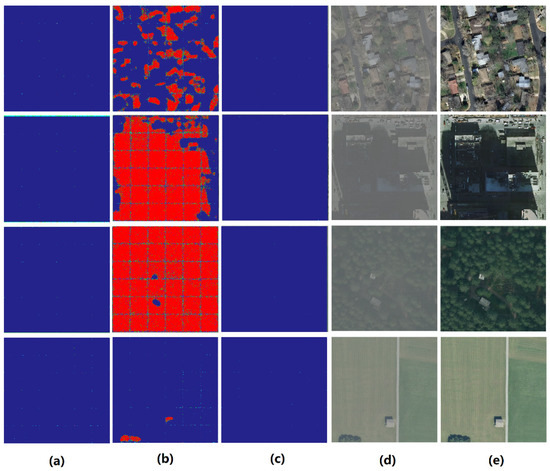 Two-step DRL_Dehaze results at a uniform-haze scale in various areas. (a) First action maps, (b) second action maps (at the beginning of the DRL training process), (c) second action maps (after the DRL training has advanced), (d) hazy aerial images, and (e) dehazed clear aerial images (action (a,c) maps are adopted).