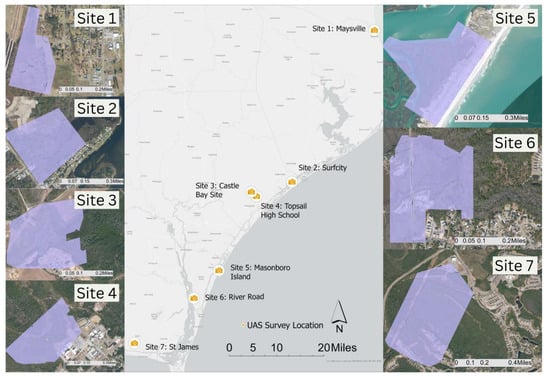 Data at seven sites (the Masonboro site was sampled twice based on tide conditions) shown in Table 1 and Figure 1 were collected in a Coastal Plain region in Southeastern North Carolina, United States using UAS and ground surveys. These wetlands sites were chosen to include various types of wetlands, such as Palustrine Forested (PFO), Palustrine Scrub-Shrub (PSS), Palustrine Emergent (PEM), Unknown Perennial Riverine Unconsolidated Bottom (R5UB), Intertidal Estuarine Emergent (E2EM), Marine Intertidal Unconsolidated Shore (M2US), and Subtidal Estuarine Unconsolidated Bottom (E1UB). Both UAV LiDAR and multispectral data, as well as ground reference habitat points were collected during same-day surveys at all sites between May 2020 and January 2021.