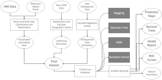 These tree boosting models were applied to predict the wetland presence by using the habitat points of various sites with all the predictors obtained from the LiDAR and Multispectral data (Table 2). Figure 2 shows the data-preprocessing methods that comprised of creating the final dataset as well as the outputs from the final Gradient Boosting models. Hyperparameters were tuned to improve the classification accuracy with the consideration of low runtimes. The set of hyperparameters were listed as below: n estimators = 500, learning rate = 0.1, max depth = 6, loss = log loss, subsample = 1.0, criterion = Friedman Mean Squared Error, min samples split = 2, min samples leaf = 1, min weight fraction leaf = 0, minimum impurity decrease = 0.0, ccp alpha = 0. The random state was kept constant in all models to avoid unexpected experimental variability.