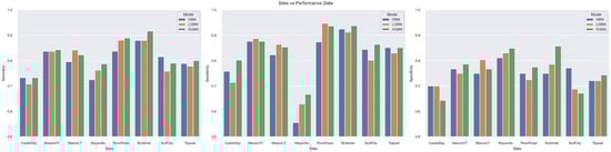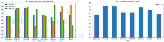As shown in Figure 10, the AUC scores, in general, were much lower than those in Supplementary Figure S7 when the model was trained and tested on a single site. This is similar to the trend for the other performance metrics since those also tend to be lower for cross site testing, when the model is trained on Leave-One-Site-Out pooled data compared to individual sites. An exception to this trend is the Masonboro Low Tide which had an AUC of 0.90 in Figure 10 but an AUC of 0.673 in Supplementary Figure S7. The respective ROC curves for XGBM on four sites, chosen in order from highest to lowest AUC, are shown in Supplementary Figure S3. The discrepancy for St James could have been caused by the unevenness of the distribution of habitat points, with 28 non-wetland points and 80 wetland points. On the other hand, Topsail and Castle Bay in Supplementary Figure S3c,d, respectively, had some of the lowest AUC values and thus the worst ROC curves out of all the sites. For some FPR values, the ROC curves did worse than random chance and led to the low AUC values. Topsail had low AUC values due to its large difference between sensitivity and specificity. Castle Bay had low sensitivity and specificity values overall, contributing to the low AUC.