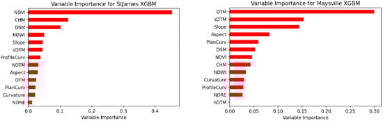 The St. James feature importance chart in Figure 4 shows that NDVI strongly correlates with the final model of the site and is more than three times more important than the next variable, CHM. This is easily visible in St. James’ XGBM Decision Tree in Supplementary Figure S1a since the top-most node in the tree is a split based on NDVI which means it has the most influence on the output. The next most important splits are CHM and DSM, which are at depth two in the tree, also representing a strong influence on the output.