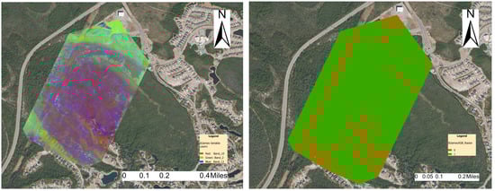 Sequoia Multispectral Data was preprocessed in two parts, the first being Post-Processed Kinematic correction (PPK), and the second being image processing []. The PPK correction method used location data collected from the onboard eBee system to track the position of the drone at the time each picture was taken and accurately position each of the images at their location. Through image processing, the location of each of the images was considered and compared to target radiometric calibration images taken at the same location and during the same environmental conditions. The same GCPs used in the LiDAR processing workflow were used to georeference the multispectral imagery with an accuracy of 10–27 cm []. The result from the preprocessing of the multispectral images created a TIFF image file that included 4 raster layers for green, red, red edge, and near-infrared reflectance values.