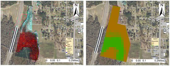 Maysville’s XGBM used Slope, DTM, and sDTM raster layers to classify areas, represented in Figure 6 (left). The highest performing variable was the DTM raster layer, which was represented by blue colors, followed by the sDTM raster layer represented by the green pixels, and the third highest performing variable was Slope, represented by the red pixels. The wetlands had a distinct correlation with areas of low elevations, shown by the distinct lack of blue and green pixels in the areas close to the center of the site in Figure 6. Areas around the wetland areas are elevated in height as shown by the prevalence of both green and blue pixels to the north of the site. These elevated regions also have red hues that signify steep slopes in the center of the site, signifying changes in elevation. Steep slopes leading to lower elevations leads to the pooling of water in water-saturated soils, and thus the formation of wetlands. The XGBM performed poorly on the Maysville site, over-classifying the non-wetlands and contributing to the XGBM’s low accuracy with wetlands. Several factors may have influenced the model’s performance including the low number of habitat points and the majority of the sampled points being classified as non-wetlands.