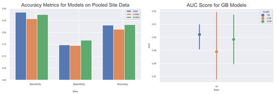 Performance metrics (Sensitivity, Specificity, Accuracy, and AUC scores) for three Gradient Boosting models on pooled data.