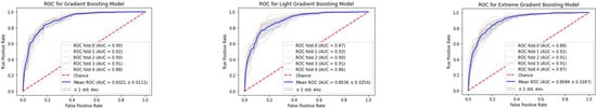 The ROC Curves in Figure 8 show that all three models had very similar shapes and variability. The ROC curves for individual folds also did not stray far outside of the ±1 standard deviation range. GBM had a slightly higher mean AUC than XGBM, while both models had a higher mean AUC than LGBM. GBM had the least variability in its AUC score, a stark difference from the large variability GBM had when trained on individual sites in Supplementary Figure S7. This means GBM likely can perform much better with larger sets of data, with a bigger increase in performance than XGBM and LGBM.
