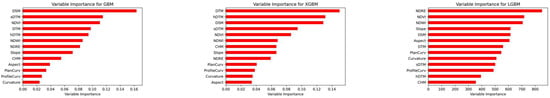 GBM and XGBM have very similar feature importance charts, while they both greatly differ from the LGBM feature importance chart (all shown in Figure 9). Both GBM and XGBM rank elevation-based variables like DSM, sDTM, hDTM, and DTM within the five most important variables for wetland prediction. They both also rank NDVI in the top five most important variables. On the other hand, Curvature-based variables such as PlanCurv, ProfileCurv, and Curvature are ranked among the less important variables in XGBM and GBM.