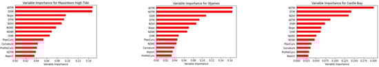 In Figure 11, both Castle Bay and St. James had the same list of the top six most important variables (in no particular order): DTM, DSM, sDTM, hDTM, NDVI, and Slope. Masonboro High Tide was slightly different, however, due to it including NDRE in the top six at the expense of hDTM which ranked the second-last. These feature importance charts were very similar to the XGBM Feature importance chart from Figure 9, but that was to be expected since both of them are based on pooled data.