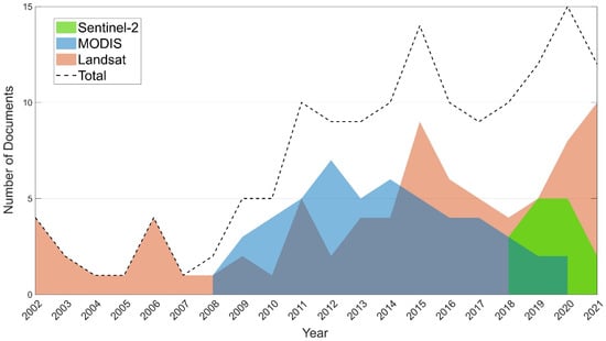 Figure 1 describes the number of studies exploiting specific satellite products for flooded area and wetland inundation mapping. Relevant documents that met the search criteria were found starting from 2002, 2008, and 2018 onwards for Landsat, MODIS, and Sentinel-2 data, respectively. Therefore, it is worth highlighting that the dates reported in the figure do not refer to the years of the launch of each. It is interesting to remark that the total number of studies (dashed black line) increased significantly over time thanks to the increased availability of free-of-charge data. Considering that Landsat is the longest-running remote sensing system, it also represents the most used dataset. MODIS and Sentinel-2 are more recent missions, and their trends are not clearly detectable. Nevertheless, it seems that MODIS initially received a good level of attention, while the number of studies exploiting this product started to slightly decrease after 2012. On the other hand, the history of Sentinel-2 has still to be written, since the 2B instrument started to operate only in 2017, and few documents on the topic of interest were found from 2018 onwards.