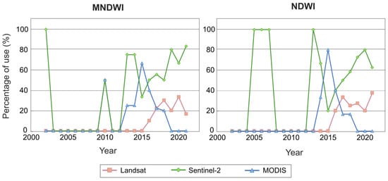 Percentages of applications of the Modified Normalized Difference Water Index (MNDWI, left panel) and Normalized Difference Water Index (NDWI, right panel) from 2002 to 2021 using Landsat (pink line), Sentinel-2 (green line), and MODIS (blue line) data.