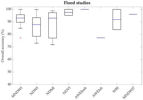 Results of the performances of spectral indices in detecting flooded areas, expressed in terms of overall accuracy (OA). The blue line represents the median value of the OA of each index, while red crosses represent outliers.