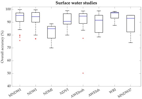 Results of the performances of spectral indices in detecting land surface water, expressed in terms of overall accuracy (OA). The blue line represents the median value of the OA of each index, while red crosses represent outliers.