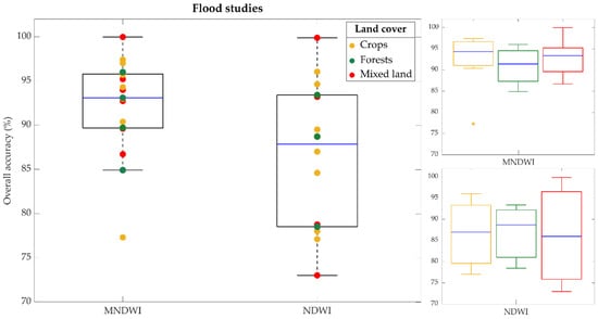Most of the flood studies included regions in which agricultural areas constitute the main land cover type (e.g., [,,,]). Other studies were focused on regions mainly covered by forests (e.g., [,,]), while only a few included urban areas or artificial surfaces and wetlands (e.g., [,]). Finally, some studies were carried out on the watershed scale (e.g., [,,]); the performance metrics, thus, referred to the entire study area, and it was not possible to discriminate among land covers. For this reason, we considered three main classes to carry out a classification of the performances according to the land cover settings, namely, crops, forests, and mixed land. The latter indicate heterogeneous areas that include the contemporary presence of the first two classes, wetlands, urban areas, and/or artificial surfaces. Figure 5 shows the results of the accuracy evaluation of the MNDWI and NDWI for the three selected land cover categories. First, as highlighted above, the MNDWI showed better performances than the NDWI, both in terms of median values and data variation (left panel). Moreover, the MNDWI always showed the best performance in all three land cover categories (upper-right panel) compared with the NDWI in the same categories (lower-right panel). In terms of OA, the median values for the MNDWI were always above 93% for both crops and mixed lands (94.30% and 93.36%, respectively) and above 90% for forest areas (91.40%), while for the NDWI, values never exceeded 90%, with the highest value being observed in forests (88.70%) and the lowest in mixed land (85.98%). For croplands, the NDWI had an OA median value equal to 87%. As regards data variation, MNDWI values showed the lowest spread, while higher variation was observed for NDWI values, with the highest spread of mixed land data.